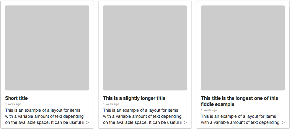 The best thing is that you can change the available space, and the image (represented with a grey square) will scale properly, the title will adapt to the available room and the text underneath will try to fill the available space. Check this example that shows the same items when the width increases. I found this out having a look at the Discover feature on the Spotify Web Player, I realized that even though the images were scaled when changing the screen width, the text underneath was never cropped. It turns out that every line of text has the same height, regardless of the font size. Thus, the title can expand multiple lines and will push the rest of the text. The lack of ellipsis is solved by adding a "More" link:
